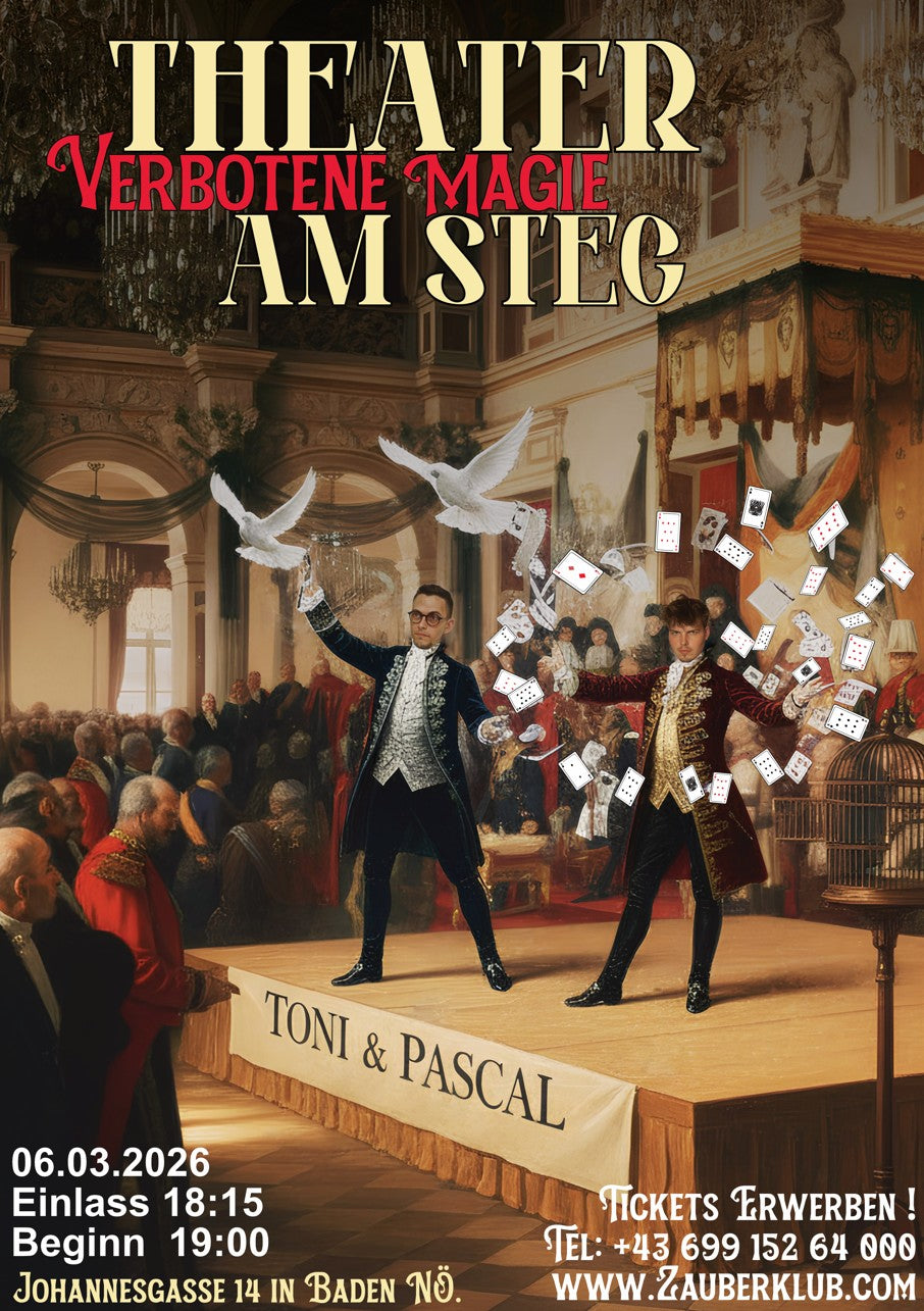 Am 6. März entführt Sie das magische Duo Toni & Pascal in eine Welt, in der Wissenschaft und Zauberei untrennbar miteinander verbunden sind. In der historischen Kulisse des Theater am Steg in Baden bei Wien erwacht das geheimnisvolle Wissen vergangener Jahrhunderte zum Leben – unterhaltsam, verblüffend und voller Theatralik.