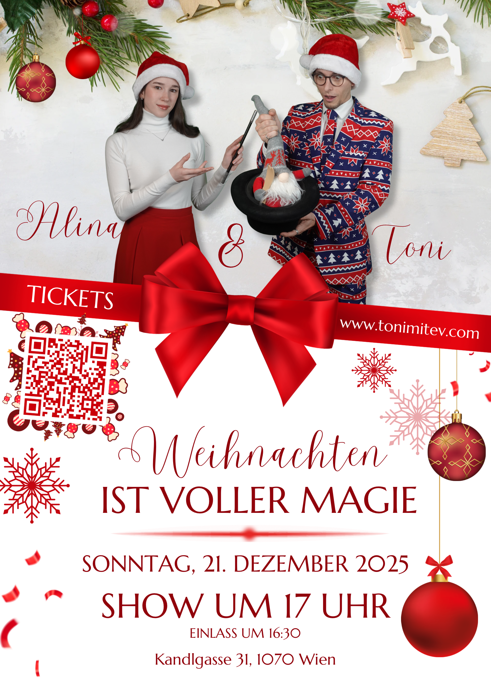 Am 21. Dezember laden Toni Mitev & Alina zu einem besonderen, einmaligen Zauberabend ein, der die Herzen wärmt, die Fantasie entzündet und die Gäste aller Altersgruppen in festliche Stimmung versetzt.